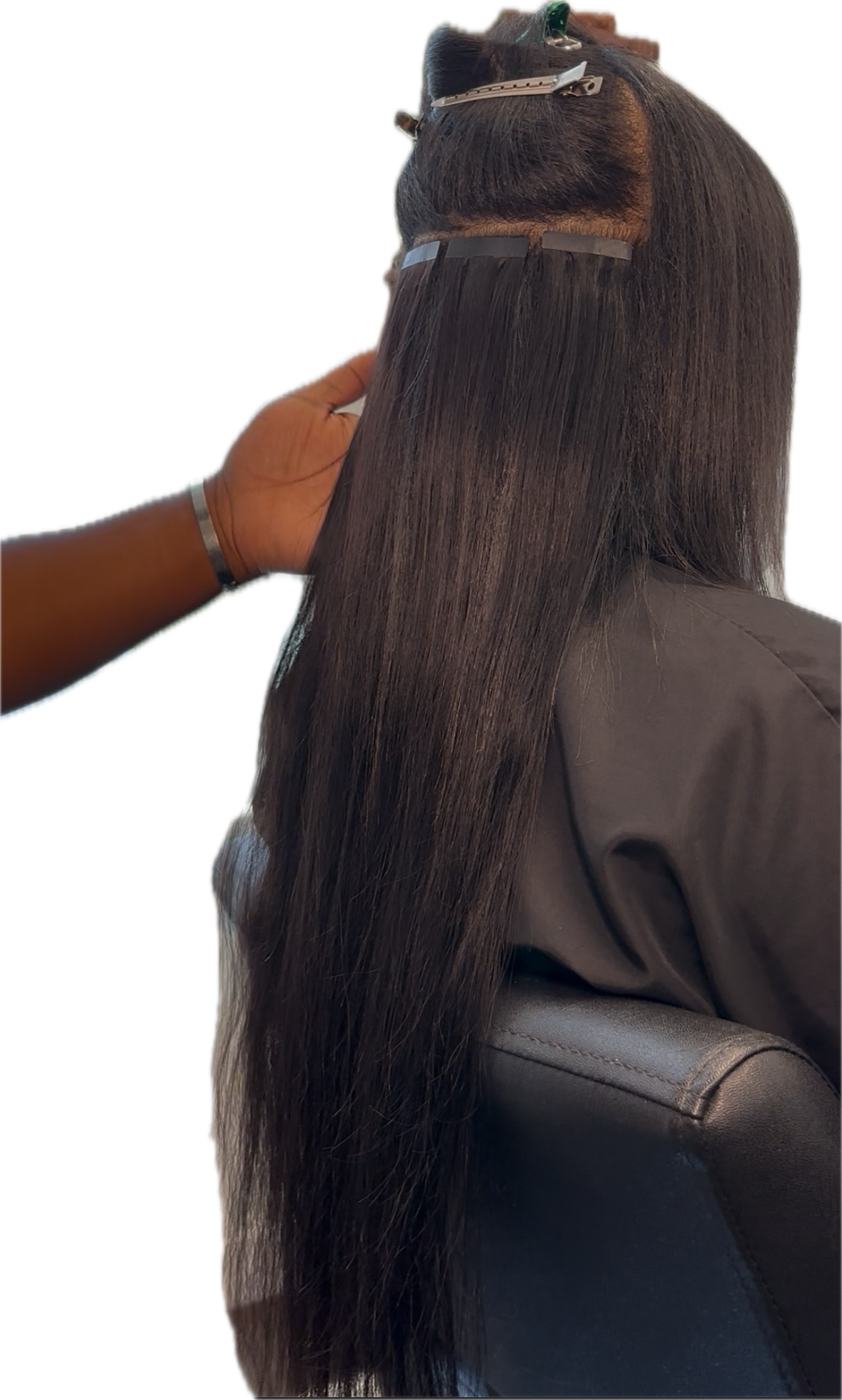A Silk Press that includes a 6-12 week treatment that provides strengthening and frizz free results alongside a full tape in extension installation that requires and includes 60 single tape in extensions or more . Book your consultation today!